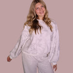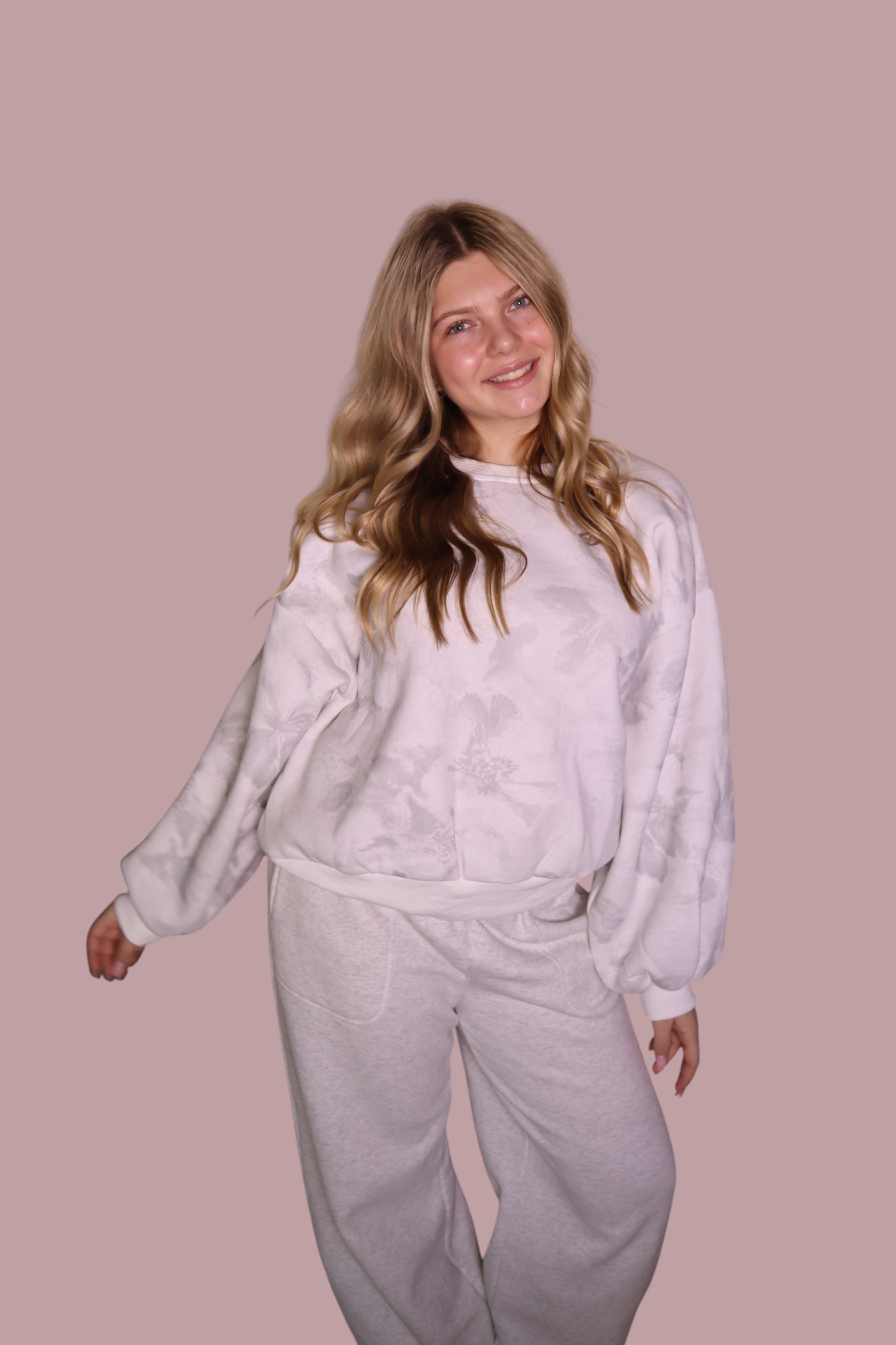 A light gray oversized crewneck with a floral touch—simple, cozy, and effortlessly cute. This oversized crewneck features soft washed fabric with a subtle tie-dye finish and ribbed trim for the perfect laid-back look. Cute, comfy, and effortlessly chic—made to style your way, every time.